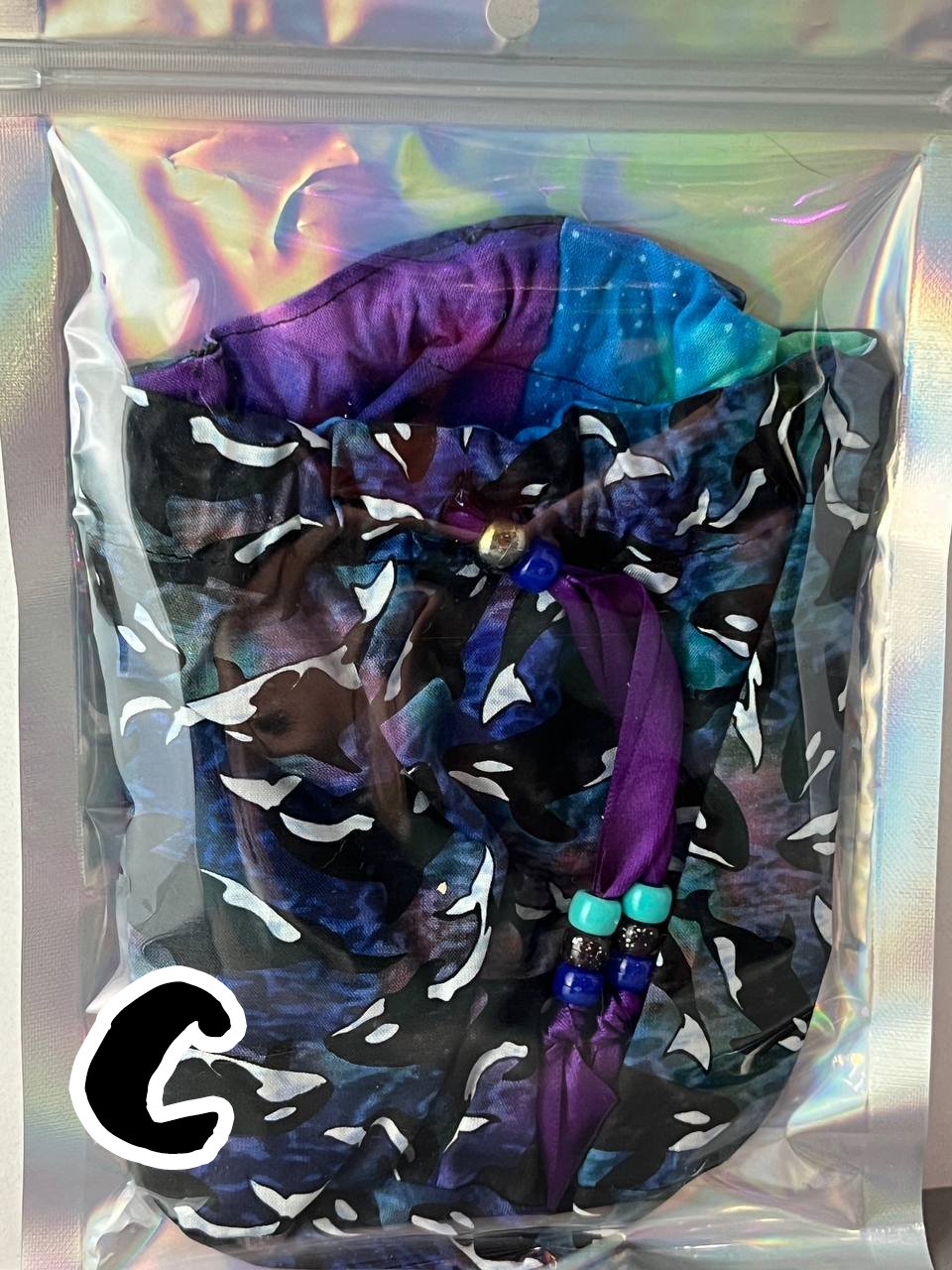 A handmade dice bag for all your dice hoarding needs! Featuring a round bottom, with a ribbon drawstring and a bead slider to hold it closed. Fits around a hundred (100!!!) standard-ish sized polyhedral dice.