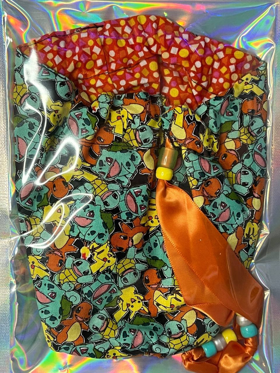 A handmade dice bag for all your dice hoarding needs! Featuring a round bottom, with a ribbon drawstring and a bead slider to hold it closed. Fits around a hundred (100!!!) standard-ish sized polyhedral dice.