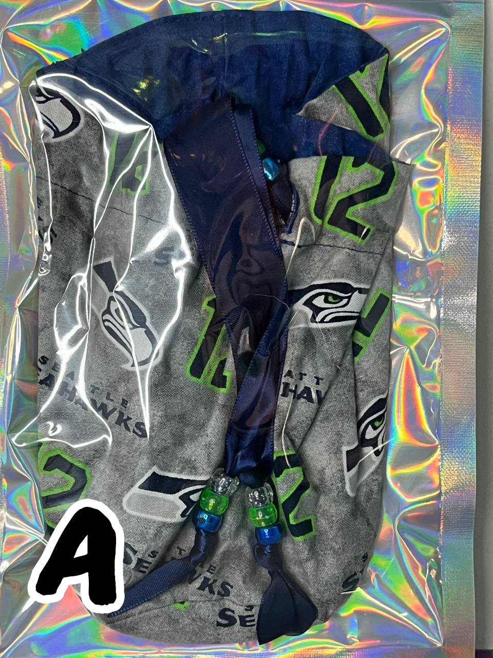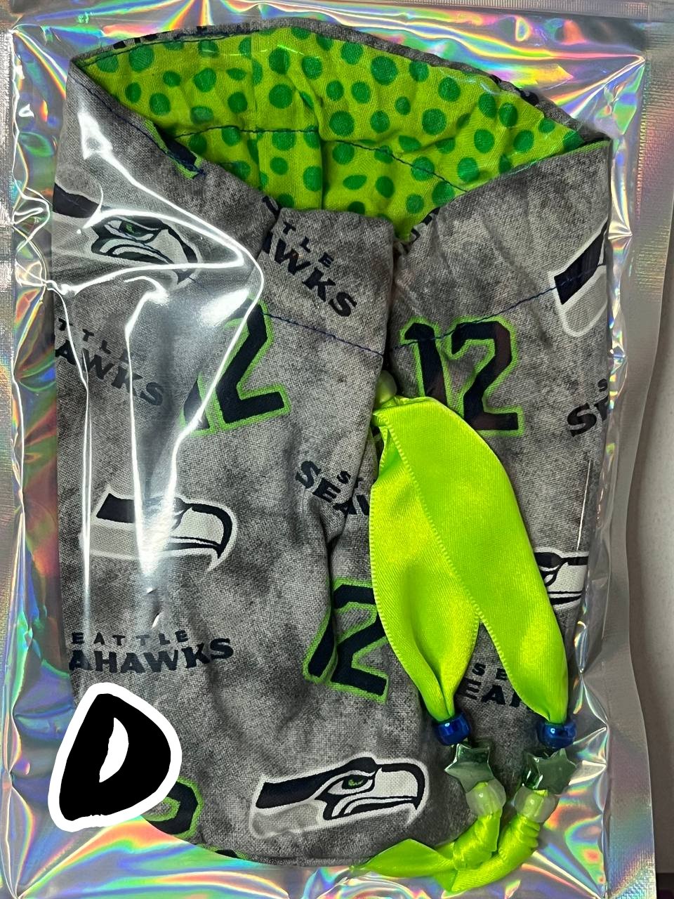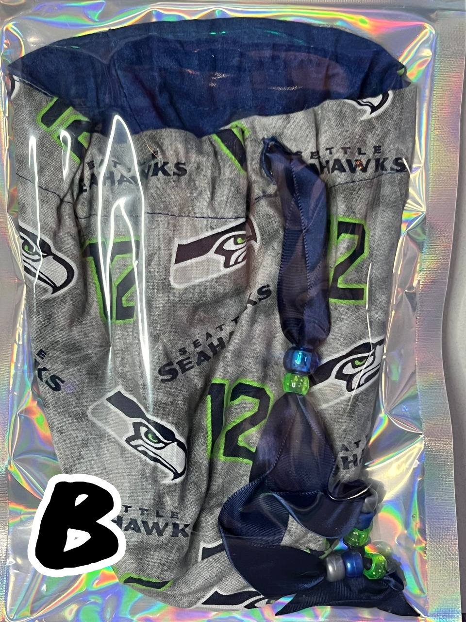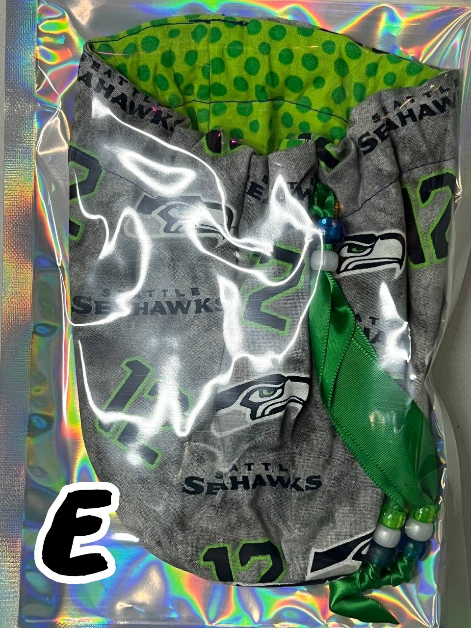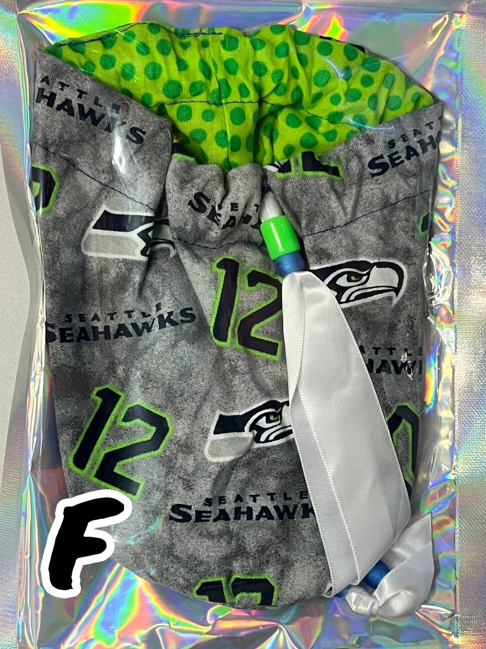 A handmade dice bag for all your dice hoarding needs! Featuring a round bottom, with a ribbon drawstring and a bead slider to hold it closed. Fits around a hundred (100!!!) standard-ish sized polyhedral dice.