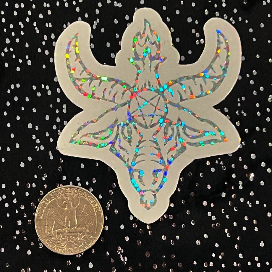 This sticker is 2.5" tall, and features a glittery picture of Baphomet against a white background.
